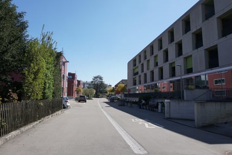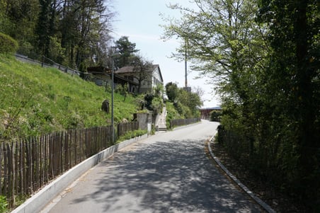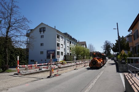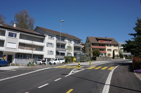 Neubau sämtlicher Strassenränder, Einbau Flüsterbelag (L = 550m), Projektieren neuer Bushaltestellen mit Züri-Bord 22cm und Aufwertung Strassenrand mit Baumpflanzungen